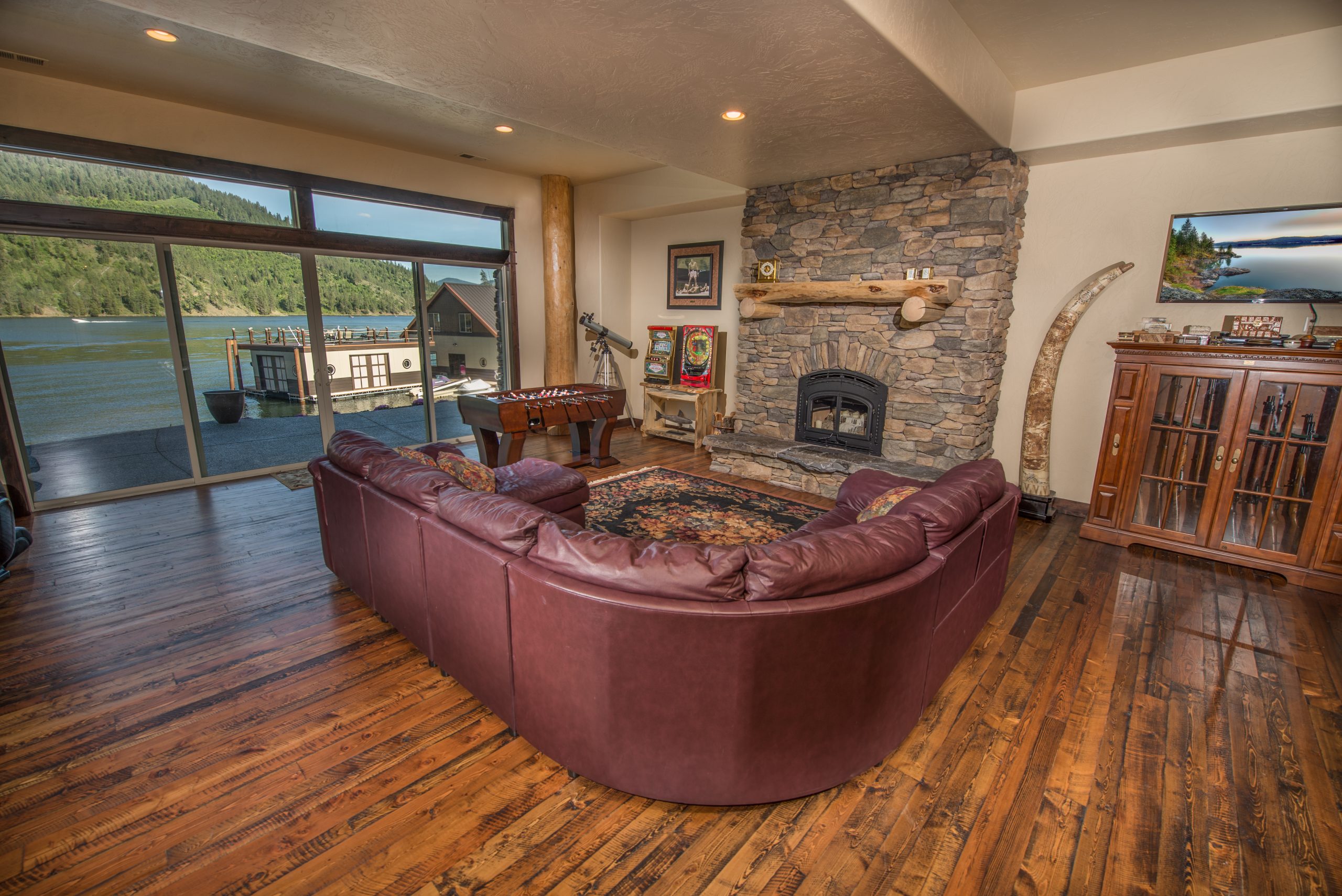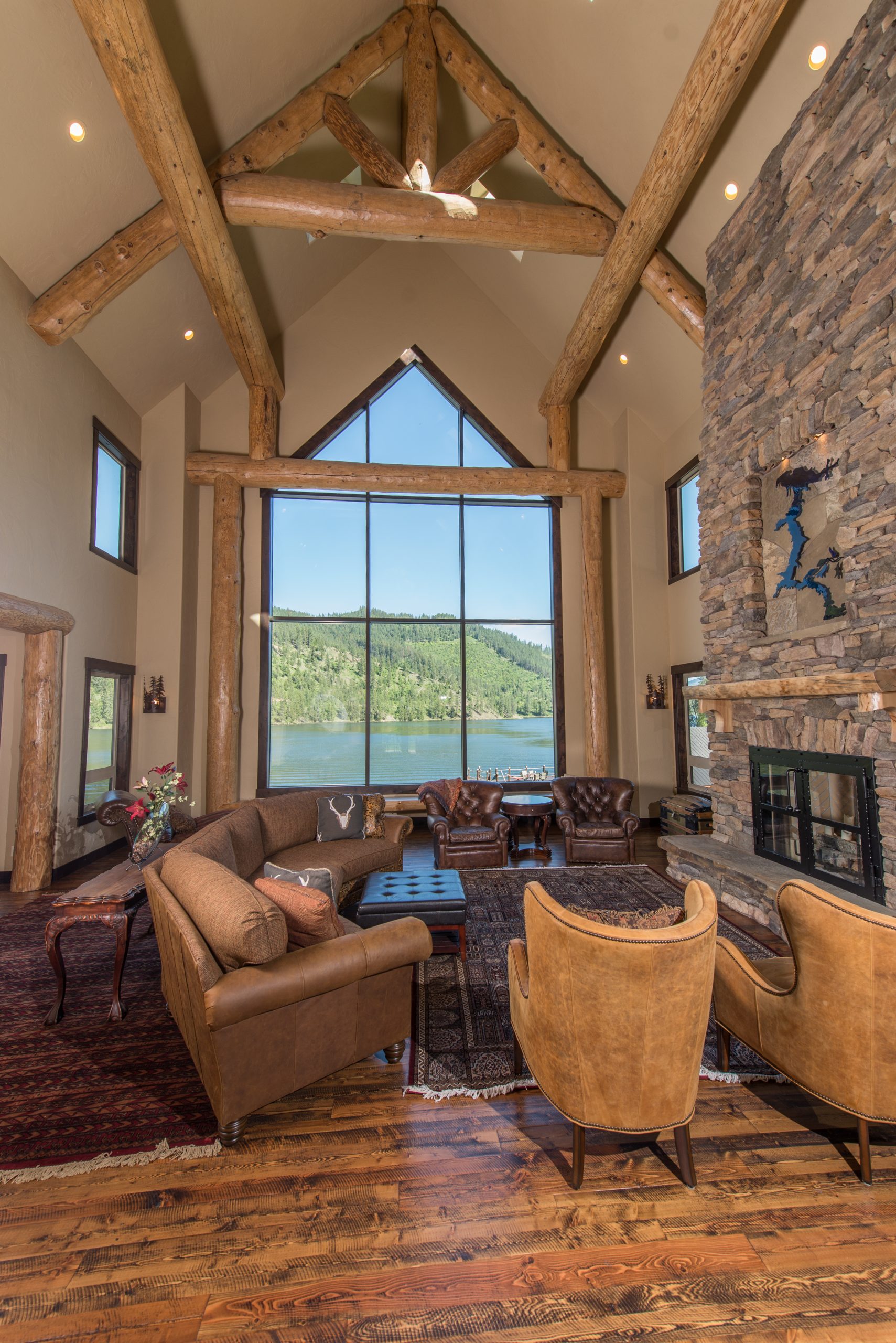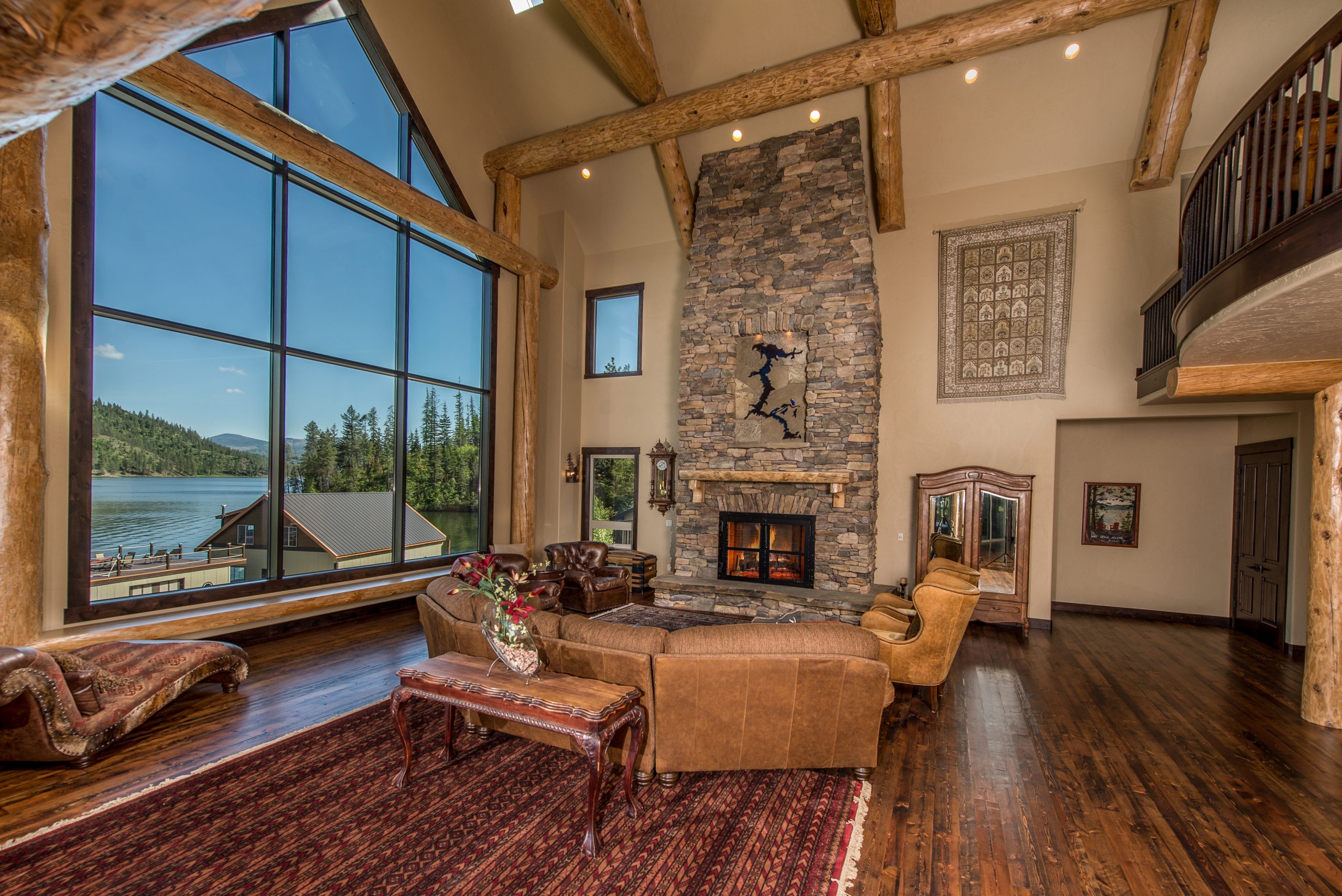 A modern take on a rustic log cabin, this lake-front property features beautiful interior and exterior stonework, exposed wood beams, and a dramatic spiraling staircase that serves as the home’s centerpiece. The sprawling, open-concept living space is ideal for entertaining family and friends.