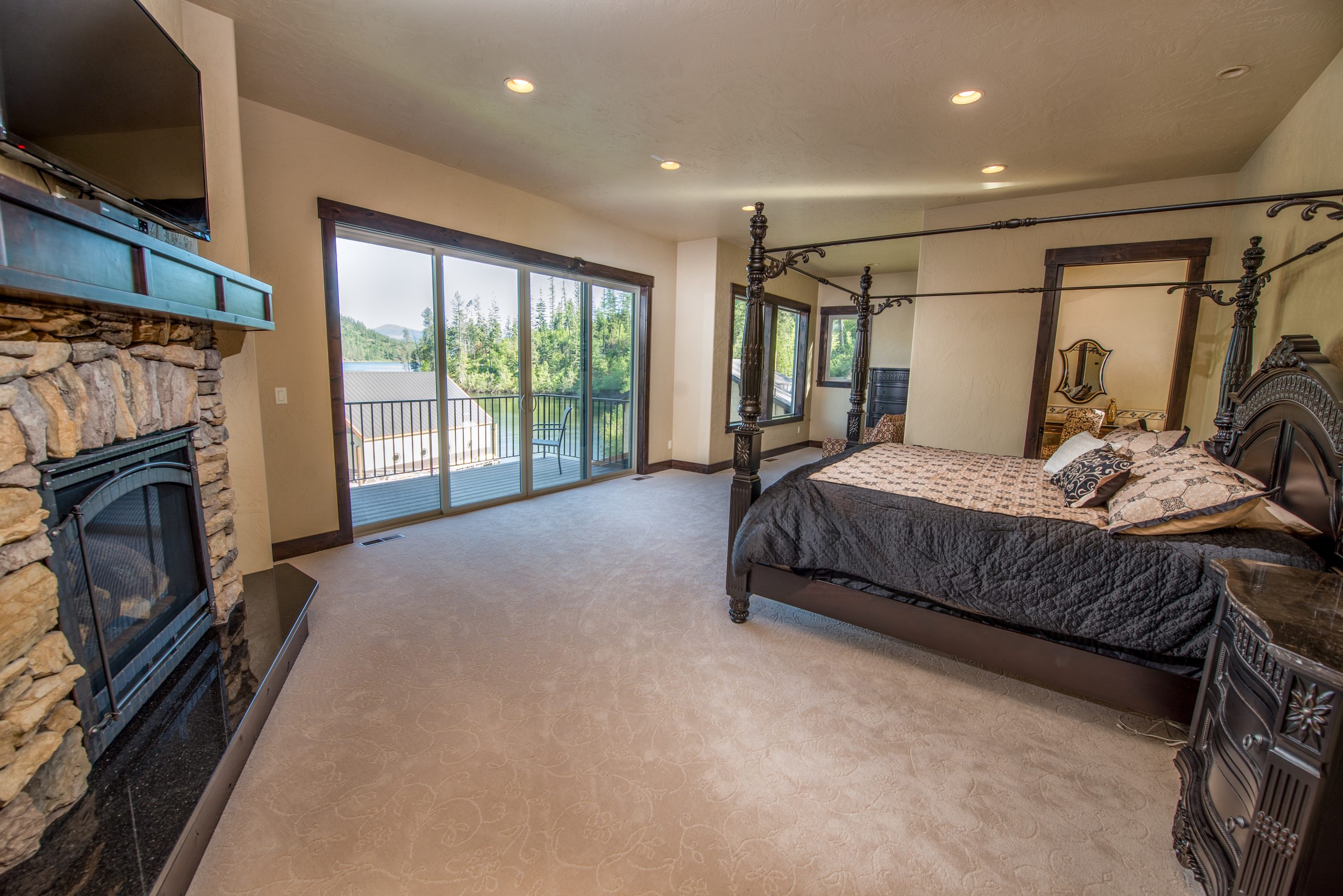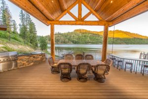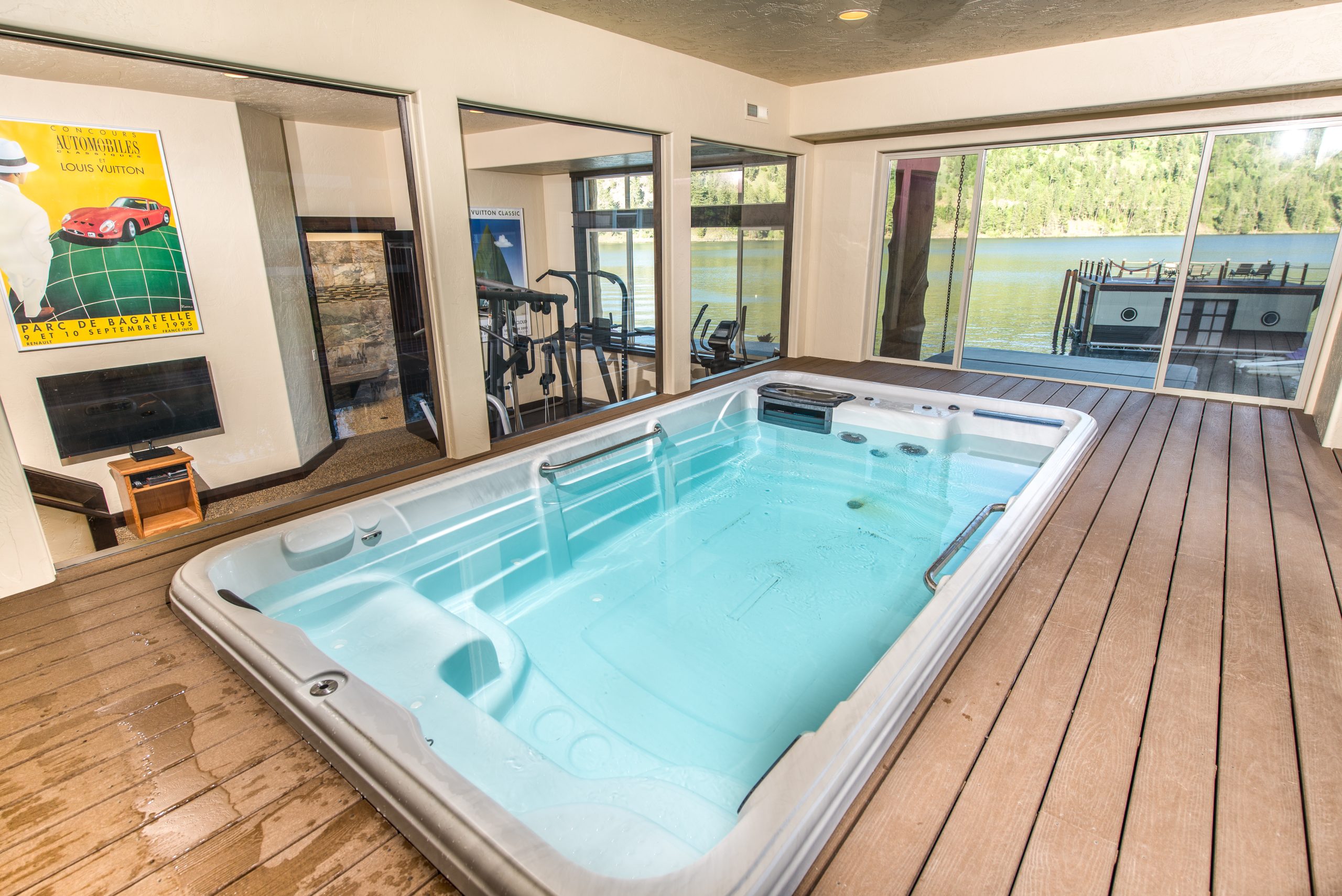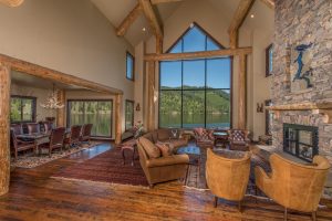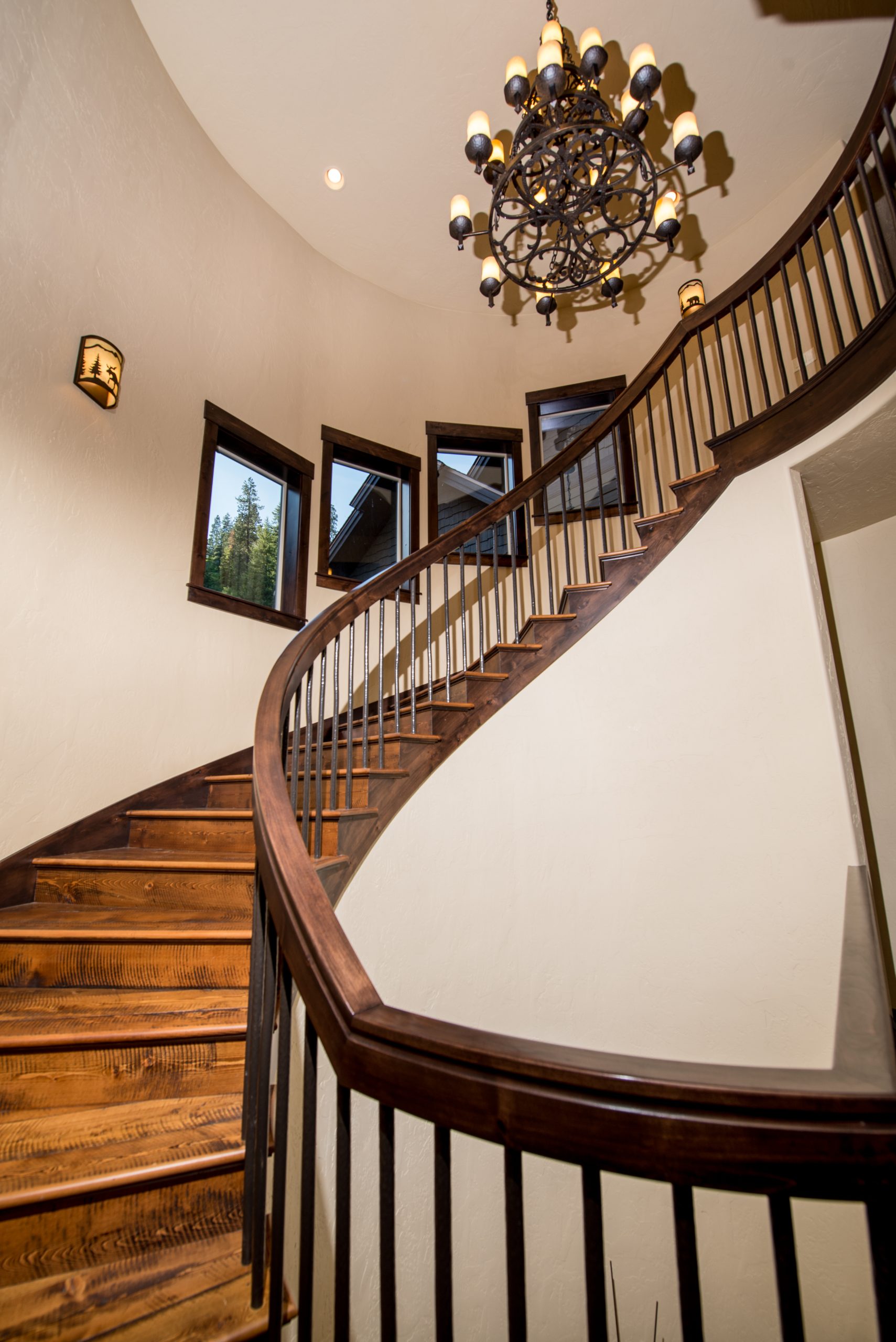 A modern take on a rustic log cabin, this lake-front property features beautiful interior and exterior stonework, exposed wood beams, and a dramatic spiraling staircase that serves as the home’s centerpiece. The sprawling, open-concept living space is ideal for entertaining family and friends.