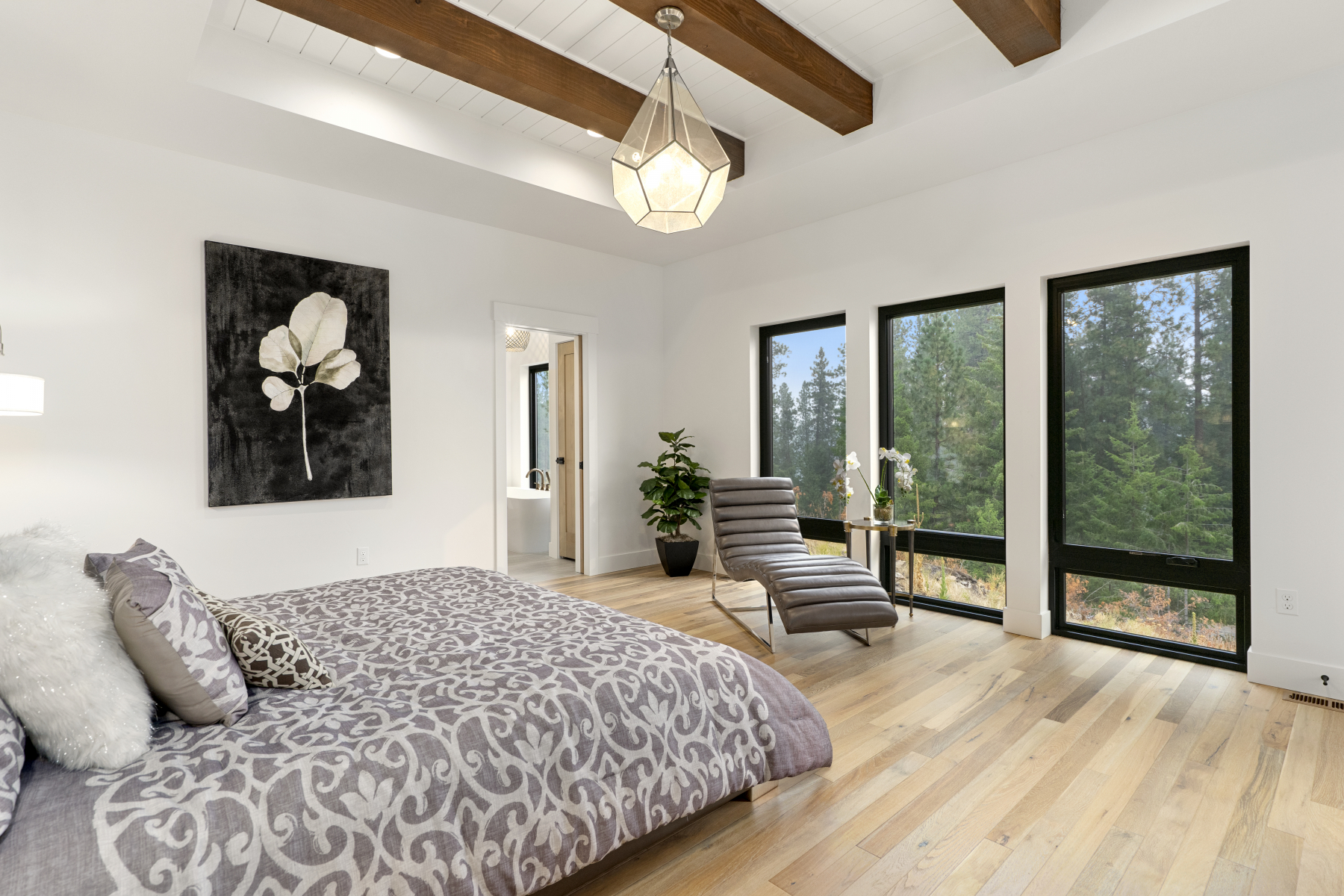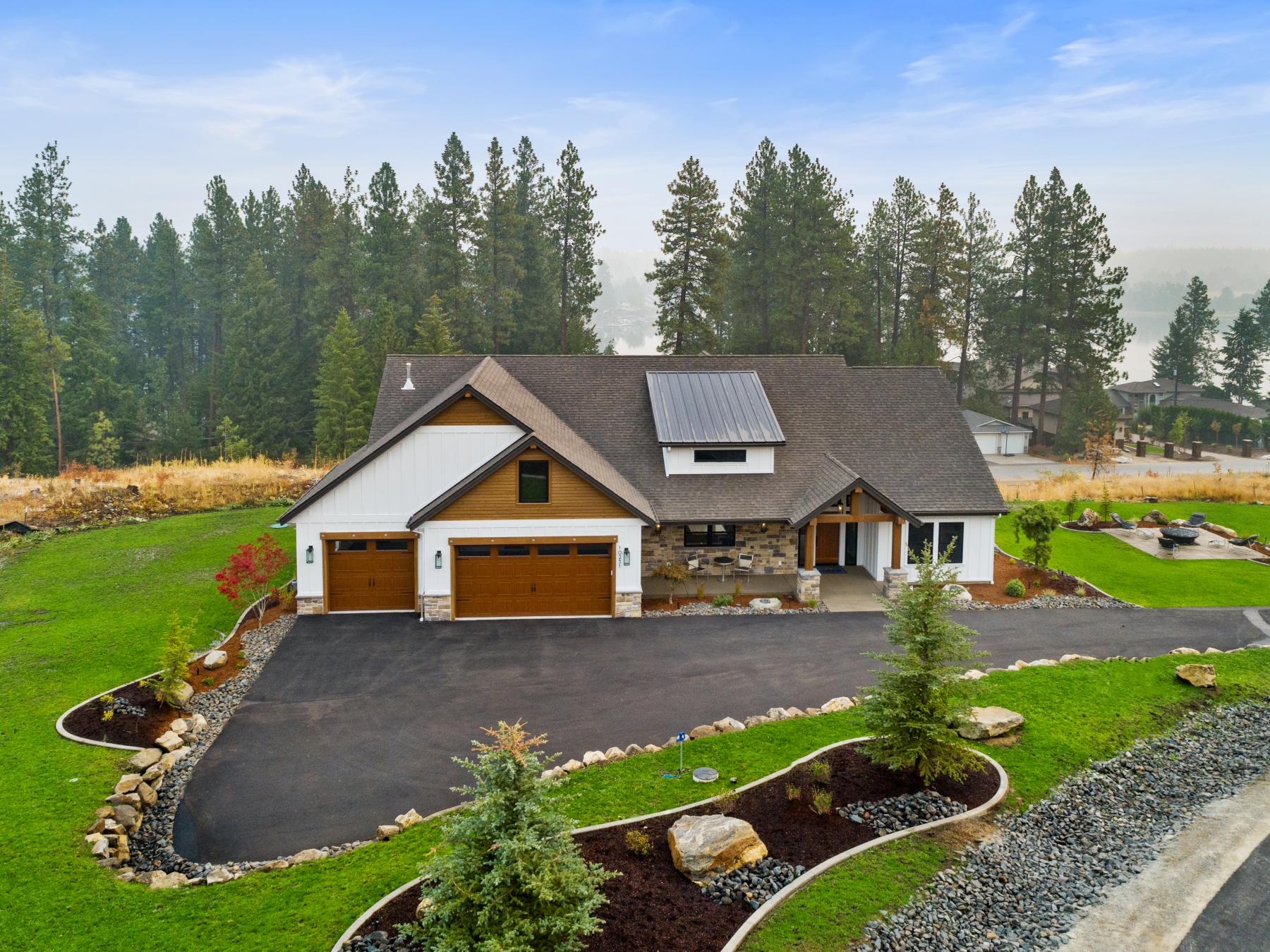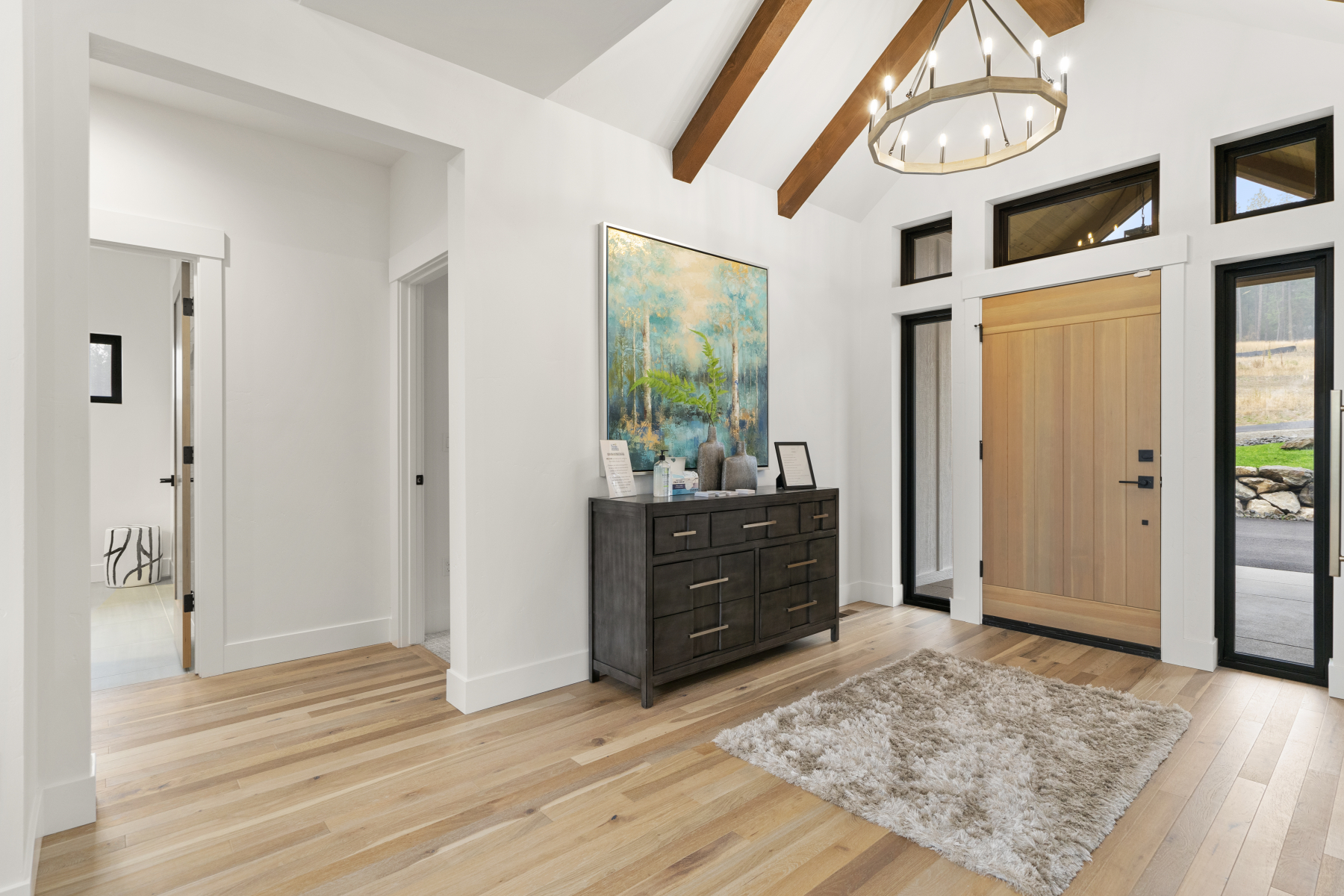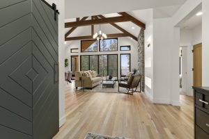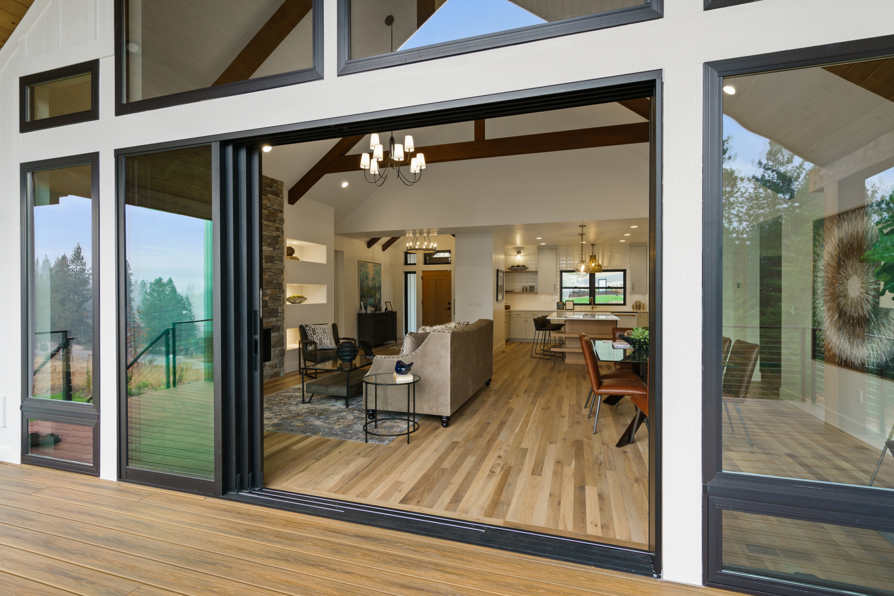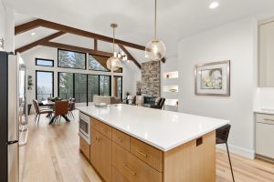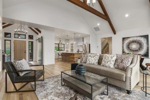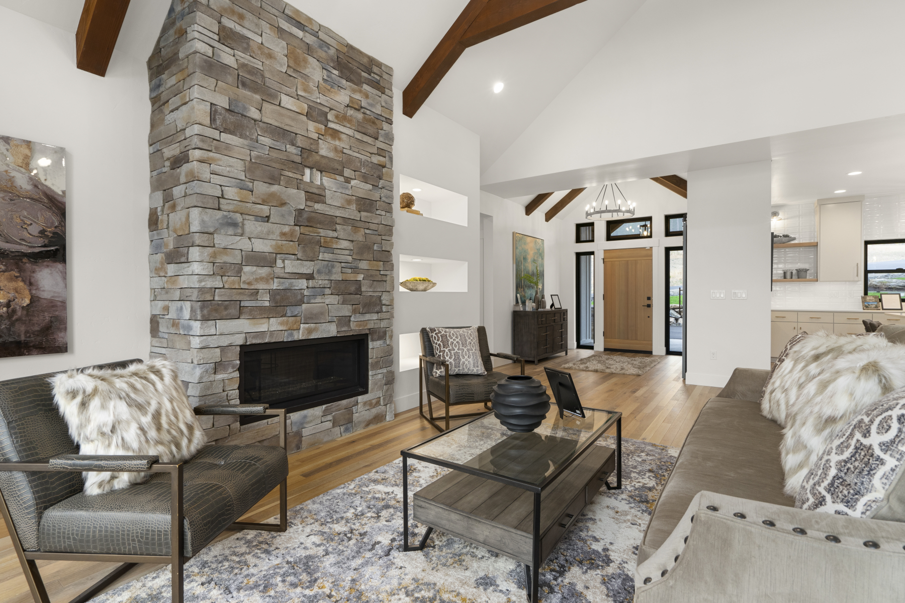 The perfect family home, this open concept design has ample windows for landscape views, a spacious outdoor patio, and plenty of beautiful architectural details. These include exposed wood beams arching across cathedral-height ceilings and a central fireplace with custom stonework.