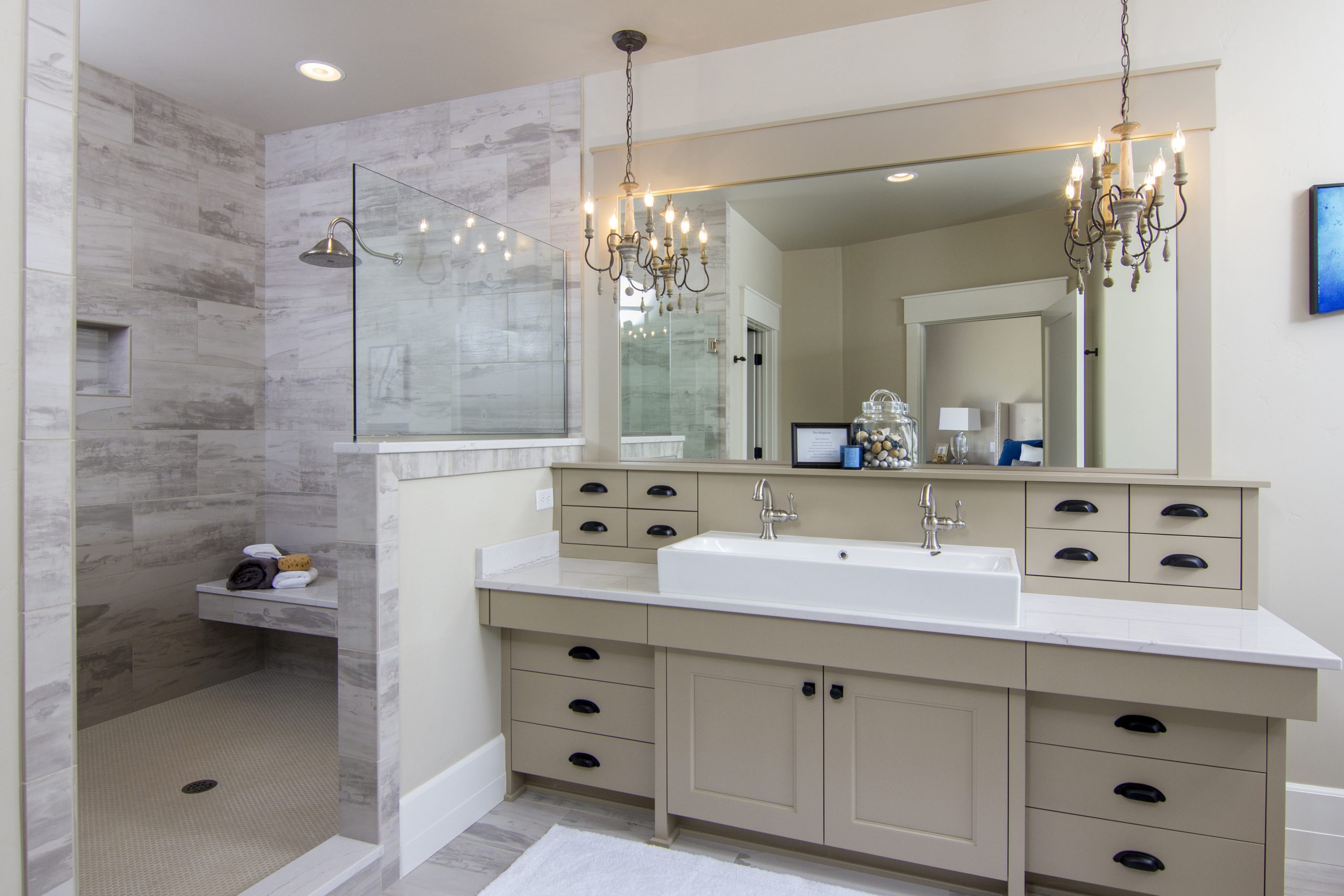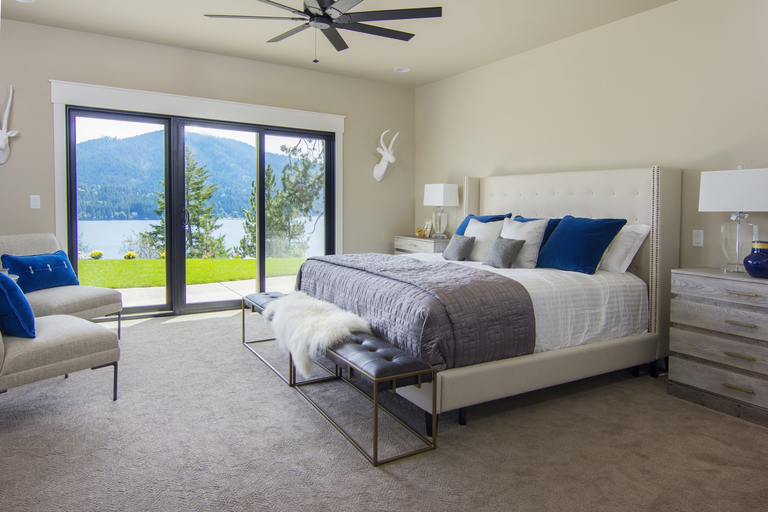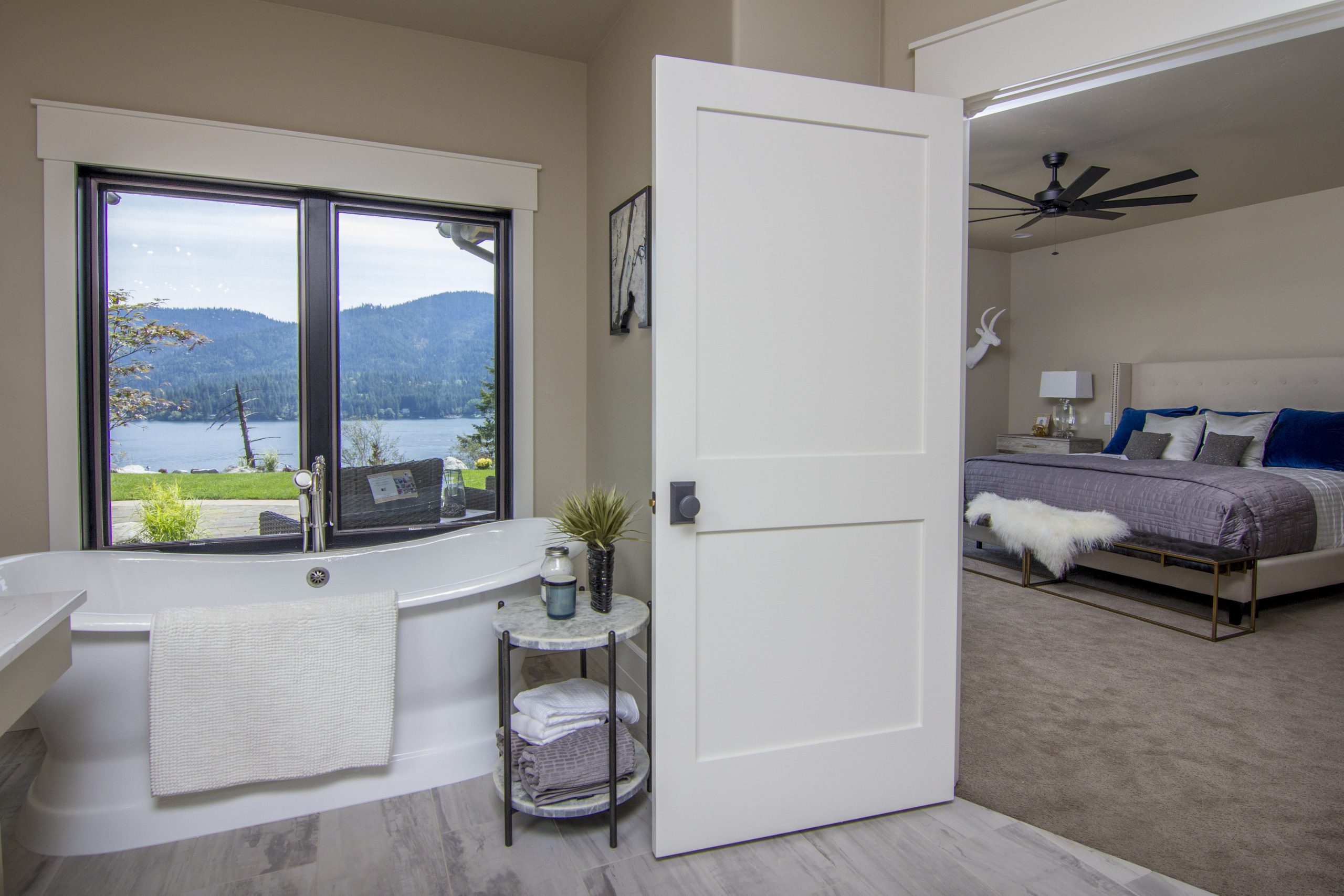 Crisp white interior finishes and an open concept give this modern farmhouse a fresh, airy feel. Add to the mix a custom reclaimed wood fireplace, exposed beams, and spectacular views, and you’ve got a home that will be the envy of all the neighbors.
